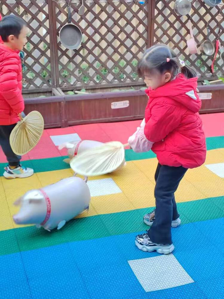 孩子们拿着扇子,赶着“小猪”奔跑,你追我赶,趣味横生。在这个过程中,孩子们的手臂力量和方向感得到了锻炼,整个赛场都洋溢着孩子们的欢声笑语。