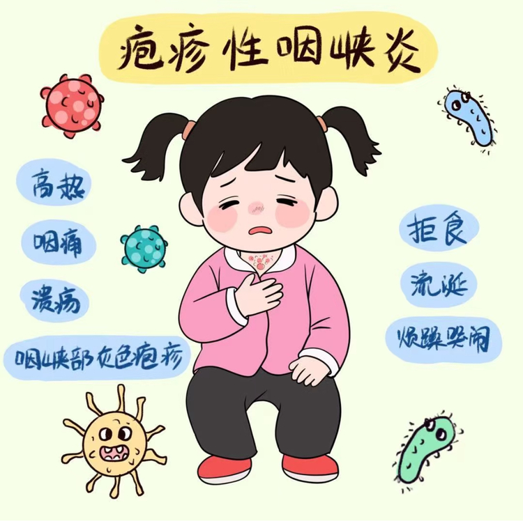 疱疹性咽峡炎是由肠道病毒引起的疾病。特征为发热和喉痛,在软腭的后部、咽、扁桃体等处可见红色的晕斑,周围有特征性的水疱疹或白色丘疹(淋巴结节)。同一患者可多次发生,由不同型别病毒引起,潜伏期3-10天。多以突发高热开始,24-48h可达高峰,升至39-41℃,伴头痛、咽部不适、肌痛等,婴幼儿常有呕吐、拒食,甚而发生高热惊厥等。