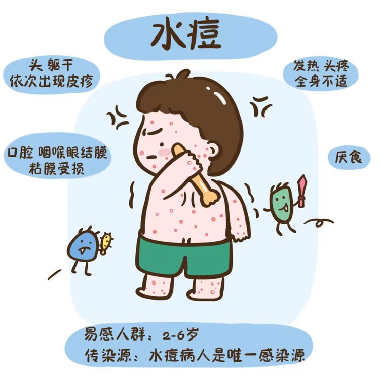 水痘是一种由水痘带状疱疹病毒所引起的急性传染病。水痘患者多为1-14岁的孩子。水痘主要通过飞沫经呼吸道传染,接触被病毒污染的尘土、衣服、用具等也可能被传染。水痘病毒感染人体后,经过大约2周的潜伏期,患者可出现头痛、全身不适、发热、食欲下降等前期症状,继而出现有特征性的红色斑疹,后变为丘疹、再发展为水疱、常伴有瘙痒,1-2天后开始干枯结痂,持续一周左右痂皮脱落。皮疹躯干部最多,头面部次之,四肢较少,手掌、足底更少。