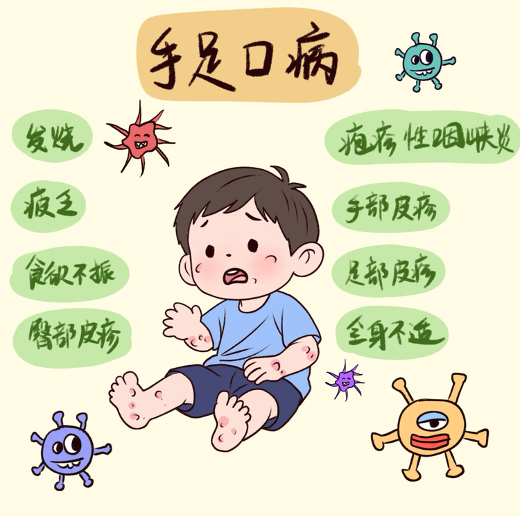 手足口病是由肠道病毒感染引起的一种幼儿常见传染病。临床症状以手足、口咽部发生疱疹为特征。婴幼儿和儿童普遍易感,以5岁以下儿童为主。密切接触是重要的传播方式,通过接触被病毒污染的手、毛巾、玩具等引起感染,还可通过呼吸道飞沫传播,饮用或食入被病毒污染的水和食物后亦会感染。常表现为口腔内颊部、舌、软腭、硬腭、口唇内侧、手足心、肘、膝、臀部和前阴等部位出现小米粒或绿豆大小、周围发红的灰白色小疱疹或红色丘疹。