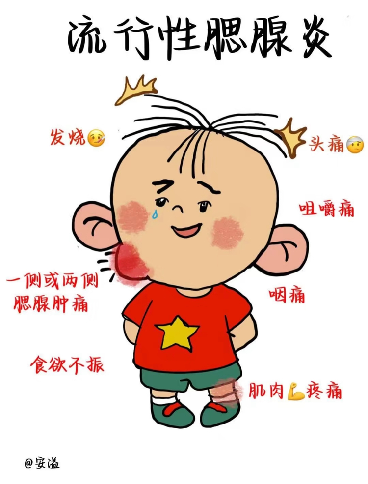 流行性腮腺炎是一种通过飞沫传播的急性呼吸道传染病。春秋季节容易发生,多发生于儿童。主要通过飞沫传染,少数通过用具间接传染,传染性强。大多数起病较急,有发热、畏寒、头痛、咽痛等全身不适症状。患者一侧或双侧耳下腮腺肿大、疼痛,咀嚼时更痛。并发症有脑膜炎、心肌炎、卵巢炎或睾丸炎等。整个病程约7-12天。一次感染后可获终生免疫。